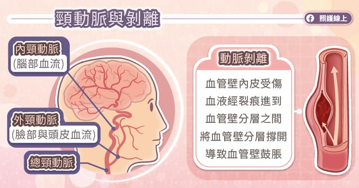 至于动脉剥离的概念,需要先了解血管壁有分层,动脉剥离代表血管壁最内层的内皮受伤,出现裂痕,以至于血管内的血液经过内层裂痕,进到血管壁分层之间,并将血管壁分层撑开,导致血管壁鼓胀。这时,血流速度会因此减缓,甚至停住,还会形成血块栓子;鼓胀的血管壁也会压迫到周遭的组织与神经,进而造成症状。