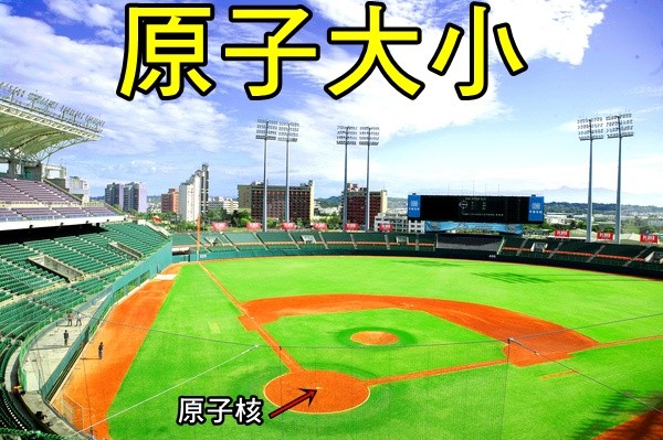 讲到这边都很抽象,原子核的大小远比原子的直径小10万倍,用实际的例子来讲,如果原子核像花生米粒般大小的话,那么整颗原子(电子可以运动的空间)就像一座棒球场一样大。