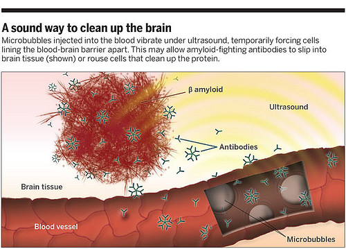 “在科学平移医学期刊(Science Translational Medicine)中,研究团队说明这项技术应用了一种特殊的超音波,叫做集束治疗超音波(focused therapeutic ultrasound),能够以非侵入性的方式,发射声波到大脑组织中。藉由极快速的震荡,这些声波得以温和地打开使大脑免受细菌感染的血脑障壁(blood-brain barrier),也会活化脑中的微胶细胞(microglial cells)。微胶细胞会清理细胞中的废物,脑中有毒的β-澱粉样蛋白硬块也会被瓦解,而这种硬块正是造成严重阿兹海默症状的元凶。”(来源)