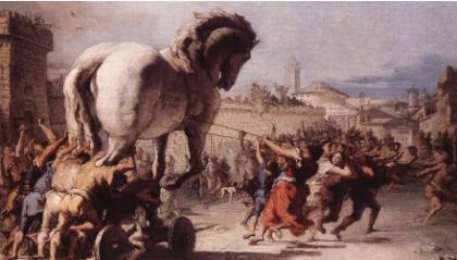 希腊士兵围困了特洛伊十年,却始终不能攻占这座城池。后来,希腊军中最有智谋的英雄奥德修斯想出一条妙计:他们造了一只巨大的木马,内藏伏兵,然后全军撤退,待特洛伊人将木马拖人城内后,半夜木马内的伏兵悄悄杀出,打开城门,希腊人里应外合,攻破了特洛伊城,临走又将繁华的特洛伊城烧个精光。但胜利的一方因为襄读了雅典娜的神庙,招致了雅典娜的愤怒,在归程途中大部分船只被雅典娜和海神波塞冬摧毁,只有几个英雄回到家乡。