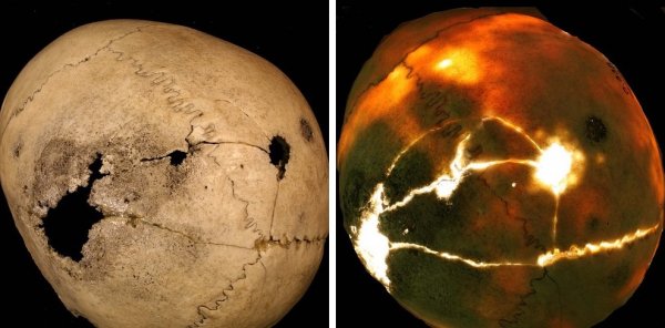 细心的读者可能会注意到在这个头骨不但有破洞,在探照灯的照射下可以发现头骨厚薄不均,这个头骨克利夫兰自然历史博物馆的收藏。显示出在抗生素出现之前梅毒对人体的侵蚀。