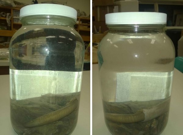 这两个玻璃瓶内装入的是绦虫,来自被被切除的病人肠道内,费城德雷塞尔大学的自然科学博物馆的馆长Ted Daeschler告诉我们。这原先是约瑟夫·莱迪(Joseph Leidy)的收藏,他是美国19世纪著名的古生物学家、寄生虫学家、解剖学和自然历史学教授。而病人是谁已经不得而知。馆长Ted Daeschler说:“至于这个标本约瑟夫·莱迪是如何搞来的,我也说不上,你可别问我。”