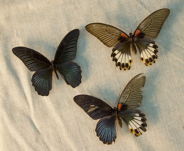 这是密尔沃基公共博物馆(Milwaukee Public Museum)收藏的雌雄嵌合体蝴蝶,它们半雌半雄,有或没有生殖器官,甚至可以有两套生殖器官。上面两只蝴蝶分别是同一品种的雄性和雌性,而下面的则是一只雌雄嵌合体,这是由于在受精卵细胞分裂的早期发生了突变。