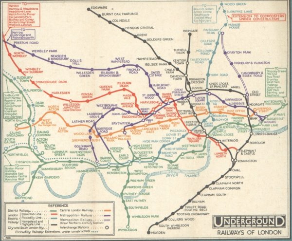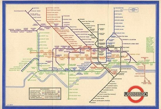 但到了1930年,人们清楚地认识到,想在一张地图上按照真实比例来反应和规划整个地铁网络,实在是一个可以让人绝望的工程。所以那时的地铁线路图往往只侧重于伦敦市中心的地铁线路的描绘。而地图上的那些幸存的地铁线路逐渐布及城市边缘地区。