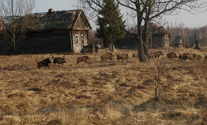 成群的野猪在切尔诺贝利废弃核电站附近的村庄中寻觅食物。