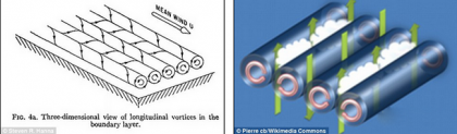 1969年,史蒂文-汉纳(Steven Hanna)提出一种解释理论,他认为线型沙丘形成于螺旋状卷形旋涡(左图所示)。空中较长的螺旋状旋涡单向旋转,之后朝向另一方向旋转,通常这种现象出现在云层,形成与风向平行的积云(右图所示)。