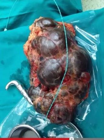 印度一男子肾重达5千克,一侧的重2.7千克,另一侧重2.5千克。而正常成年人的肾重达125—170克。男子的肾脏之所以这么大,是因为他患有一种叫做ADPKD(常染色体显性多囊肾病)的病。常染色体显性多囊肾即正常肾组织被无数小囊所代替,外形似一串葡萄,有时囊间有岛状正常组织。本病分为4型:常染色体隐性多囊肾;肾发育不良;常染色体显性多囊肾;尿道梗阻多囊肾。此病多表现为季肋部疼痛、腹痛、胃肠道症状,可有肉眼血尿,由于浓缩功能障碍有夜尿。部分患者因肾结石和血块梗阻可引起肾绞痛。此男子比较严重,发现的时候需摘除肾脏,而摘下的肾脏竟是出奇的大!