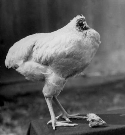 4.无头鸡麦克不死的消息传开,人们不禁啧啧称奇,它的名气建立起来。不死鸡尊容麦克在生物公司展览,它并且成为各式各样杂志和报纸的相片主题。