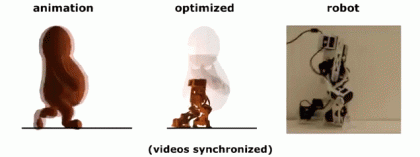 研究人员也做出了一些让步,比如说,对该动画角色的分析显示这家伙的踝和足有三个关节,每个关节都有三级自由度。在一只脚里安装九个制动器显然是不现实的,研究人员随后意识到动画角色的动作在真实世界无法还原——如果真要按照动画里面那么走,机器人肯定会摔倒。