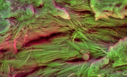 彩色扫描电子显微镜发现较长的矿化纤维,科学家猜测可能是胶原蛋白。该恐龙骨骼化石来自一种未知兽脚亚目恐龙物种。