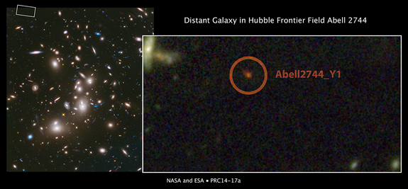 星系群Abell 2744的星系Abell2744_Y1 (inset)宇宙最远的星系之一