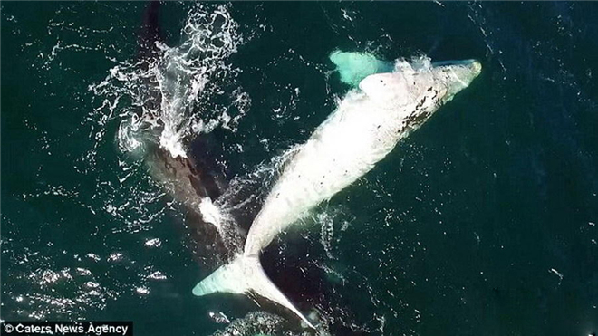 目前,无人机在南非海域拍摄到一头罕见的白化鲸鱼与母亲一同游水,它们是南方露脊鲸,在海洋中发现白化鲸鱼是非常难得的。