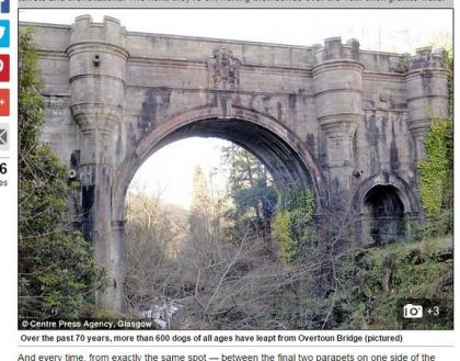 根据《每日邮报》报导,建于1895年的欧沃顿桥(Overtoun Bridge)位于苏格兰邓巴顿市的米尔顿小镇,是一座维多莉亚式弧形结构的桥梁。然而过去70年来竟有超过600只小狗从桥上奋不顾身一跃而下,由于桥高58尺(约176公尺),导致至少50条犬只丧命于此,其于皆受重伤。