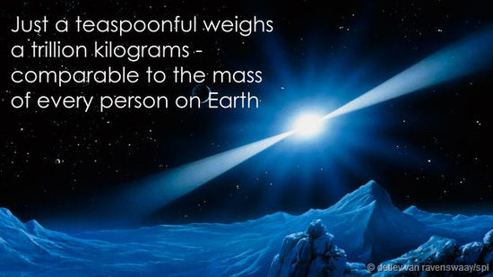 中子星物质的密度十分惊人,仅仅大约一汤匙的中子星物质,其质量就将超过1万亿公斤,这几乎相当于地球上所有人类体重的总和