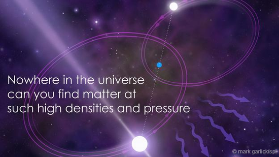 然而毫秒脉冲星可以为我们提供线索。它们发出的脉冲信号让天文学家们可以精确测定它们的轨道并据此定出它们的质量,而这一数据是理论学家们限定并提出新模型和假想理论的基础。在整个宇宙中,除了这里你找不到其他具备如此高的密度和压力环境的地方。对于物理学家们而言,脉冲星就是开展极端条件物理实验的天然实验室,甚至可能在这里找到全新的物质形态。
