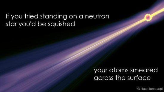 如果你要站在一颗中子星的表面,你将会立刻被压扁成薄薄的一层“物质层”,其厚度仅有一层原子那么厚,平铺在中子星的地表上