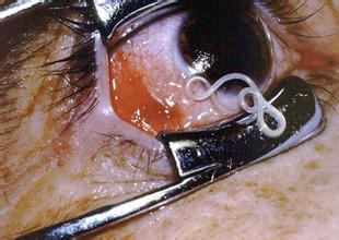 有时成年眼丝虫会爬到眼睛虹膜上,如果被感染者在这时照镜子就可以清楚地看到,它也在看着你呢!可以通过手术将它们从眼睛里驱除出去。