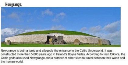 纽格兰奇墓位于爱尔兰都伯林北,是一座长廊式墓室,被认为是通往凯尔特冥界的入口。它建于5千年前,是世上已知最古老的建筑物之一。传说这处墓地是凯尔特神灵游离于人类世界和地下世界的秘密通道。