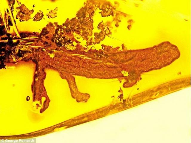 多米尼加共和国境内发现包裹着远古蝾螈的琥珀,这只远古蝾螈死亡之前曾遭受掠食者攻击。