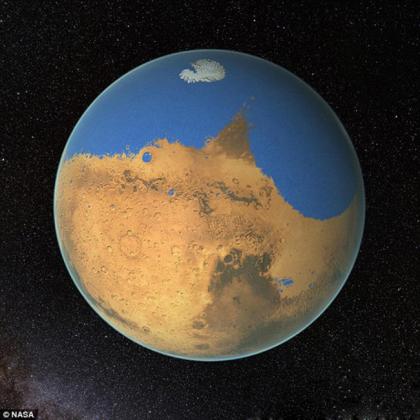 美国宇航局的科学家称太阳系内充满了液态水世界,木星和土星的卫星被认为拥有地下海洋,谷神星和冥王星也可能含有类似的大水库。由于水是地球生命的重要元素,因此有水的地方就有可能存在生命。图中显示的为火星上存在海洋的情景。