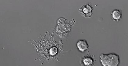 这项研究表明,单核细胞经历了细胞死亡的三个阶段,首先是膨胀,如图所示,图中左下方细胞出现膨胀。