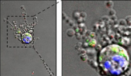 研究人员发现白血球细胞死亡过程中释放的长珠结构包含着不同分子,能够响应细胞信号、细胞生长和保养。在白血球细胞死亡过程中其它分子仍保留在内部,是图中显微镜下染色部分。