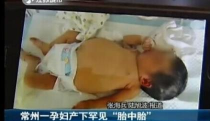 胎中胎?一个刚出生8天的女婴肚子里还有一个不成形的婴儿!这是咋回事呢?最近常州金坛市民季先生的妻子生了一个6斤多的女儿,本来是件大喜事,但季先生发现自己女儿的肚子比一般的婴儿要大得多。这是怎么回事?赶紧找医生检查,原来是婴儿肚子里面还有一个小宝宝,孕妇产下“胎中胎”,这种百万分之一概率的事情竟然让他们碰到了,医生手术取出0.9公斤胎儿,小宝宝已有头发但无心肺等器官,根本无法存活,只希望大宝宝手术后能安然无恙健康成长。