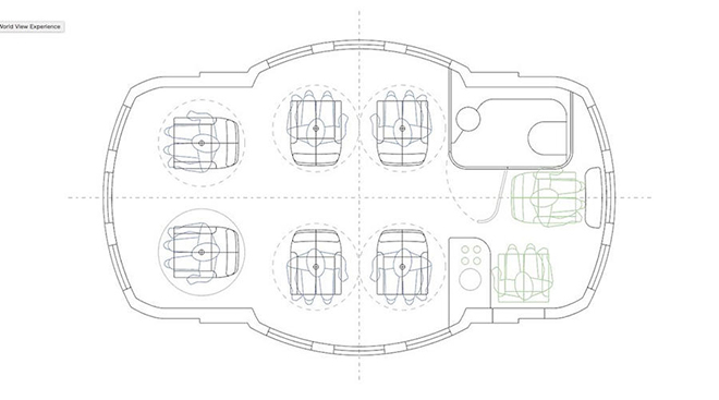 密封舱平面图,密封舱将为乘客提供360度视野并能实时上网,可以随时分享实景照片;而密封舱内配有餐饮,洗手间等便利服务与设施。