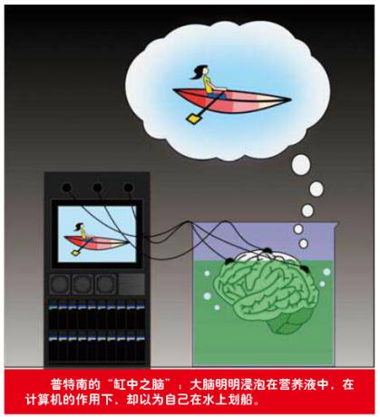 普特南在书中继续追问:“我们可以尝试去想象,并非只有一个‘缸中之脑’,其实所有人类(或许所有有直觉的生物)都是‘缸中之脑’。当然,邪恶的科学家必须是在缸外面?是这样吗?或许没有邪恶的科学家,或许宇宙仅仅是由自动化的机器组成,它们管理着一个充满神经系统的大缸。这次,让我们来假设这种白动化的机器被编程为给予我们所有人一种共同的幻觉,而不是许多不同、互不相关的幻觉。因此,当我觉得自己正在和你说话的时候,你也觉得自己正在听我说话……假设这整个故事都是真的,那么我们能否意识到我们是‘缸中之脑’呢?”