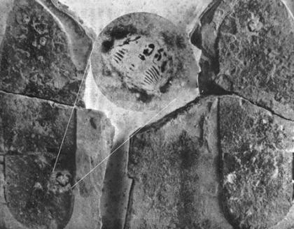 踩在三叶虫上的脚印(中间是左脚三叶虫的放大图)
