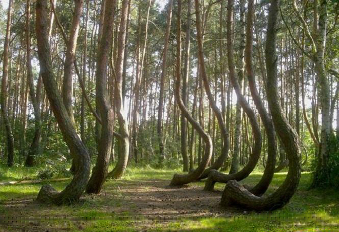 扭曲的森林:波兰西波美拉尼亚的这片小树林有着令人惊叹的奇景,大约有400颗松树违背了直立生长的原则,出现了明显的弯曲。没人知道它们弯曲的真正原因,除非这些树能够说话,否则我们永远都不会知道其中的真正原因。