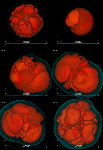 在超新星爆发会发生什么现象的讨论是个令人兴奋的题目。我们现在专注在残余物质的讨论:糊状长得像球的中子团和一些流浪的质子群。中子球受到自身简并压力(degeneracy pressure)的支撑去抵销自身的重量,简并压力是个好听的说法指的是你只能装载特定数量的中子群到一个箱子或是一个球体内。这是显而易见的中子将会占据了整个球体,但事情并不一定要照这剧本走。事实上是这简并压力造成了超新星爆发的剧烈反应。