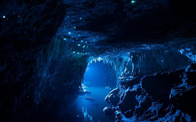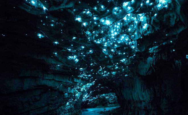 在新西兰石灰岩洞的深处栖息着无数的发光生物,它们发出的蓝绿色光芒足以照亮它们所居住的地方。这些奇特的生物被称为小真菌蚋,它们原产自新西兰的北岛地区。