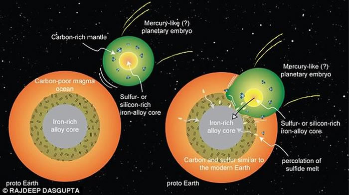 地质化学家开展的一系列实验显示,44亿年前,在地核形成之后,也许有一颗类似水星的胚胎行星撞上了地球,为地球带来了生