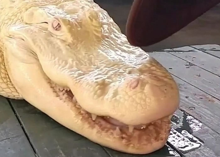 “珍珠”一身雪白。园方指“珍珠”是万中无一。美国佛罗里达州一个鳄鱼公园住有一只名为“珍珠