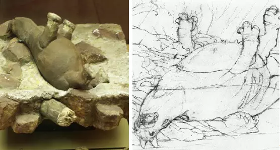 左图为展出的蓝湖犀牛模型,右图为国外网友手绘的情景模拟图。