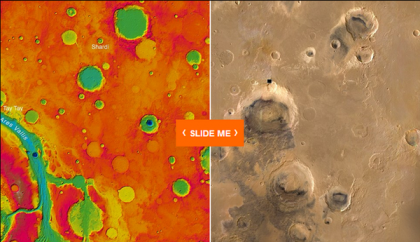 之前一些详细火星表面照片呈现的是小型、细条状图像,目前科学家首次将火星表面50-100公里宽度的细条状图像拼凑在一起