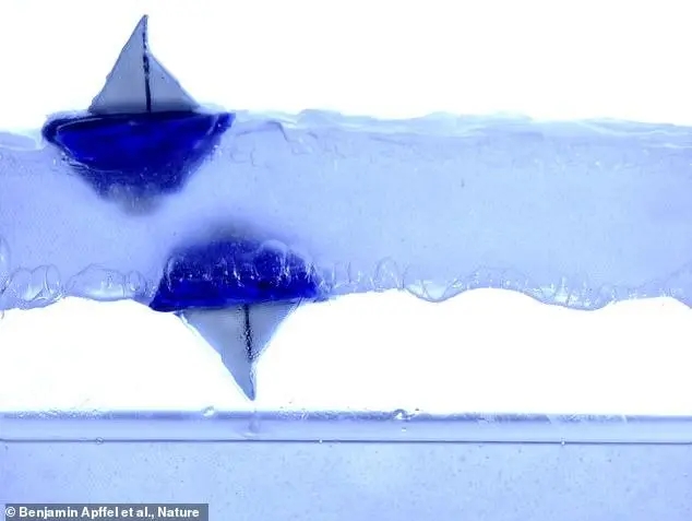 一组科学家造出一层漂浮在空气中的液体,里面放入两艘微型玩具船,一艘正常浮在液体表面之上,另一艘却可以倒过来浮在液体的
