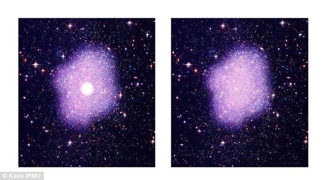 暗物质在星系中的分布示意图,左边为过去的理论认为暗物质聚集在星系中央,最新理论认为暗物质可均匀分布在星系内