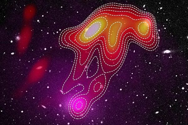 天文学家通过射电望远镜发现了一个水母形状的天体,位于距离地球大约3.4亿光年的地方,伞形的身体、身下的触角一应俱全