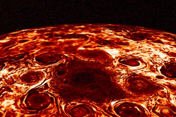 美国航空航天局(NASA)近日分享了一张由朱诺号探测器(Juno)传回的木星照片,显示的是木星北极区巨大的气旋风暴群