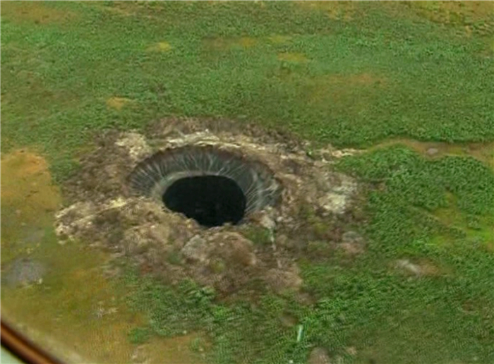 俄罗斯西伯利亚北极圈近年不断出现爆炸,栋土层被炸出一个大坑。