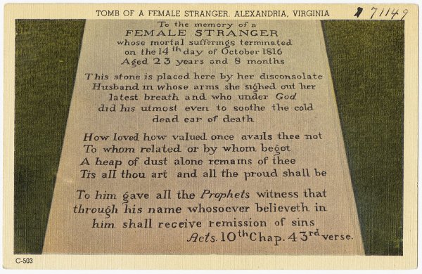 1816年,一艘船停靠在弗吉尼亚州亚历山大港,下来一对陌生的夫妇,女子病得非常厉害,很可能得了伤寒症