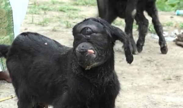 印度独眼羊。 印度东北部阿萨姆省(Assam)村庄近日诞生了一只罹患“独眼畸形症”(cyclopia)的黑色小羊,由