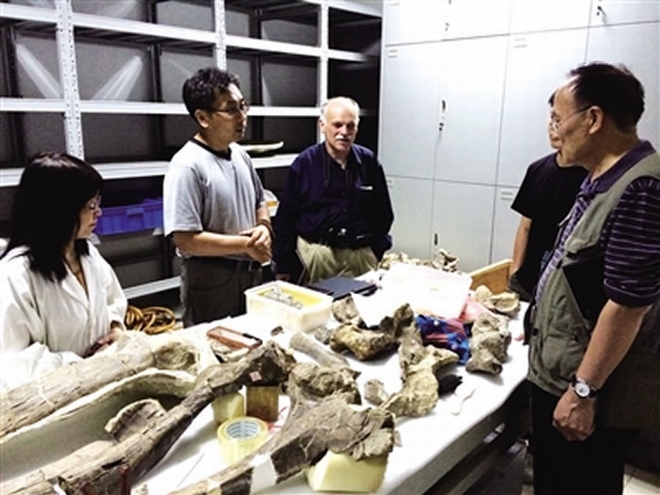 中国、加拿大古生物专家在研究恐龙化石