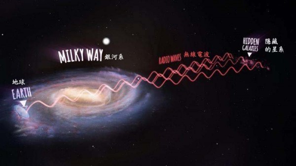 画家所画含有注解的想象图,显示无线电波从新星系出发行进,然后穿越银河系,到达在地球上的澳洲帕克斯无线