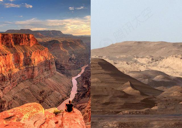 左图为美国科罗拉多大峡谷,由科罗拉多河长期冲蚀形成;右图为好奇号拍摄的火星夏普山,这里曾是一个巨型湖