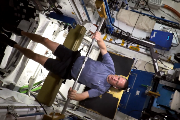 宇航员在国际太空站上进行肌肉训练。(NASA)