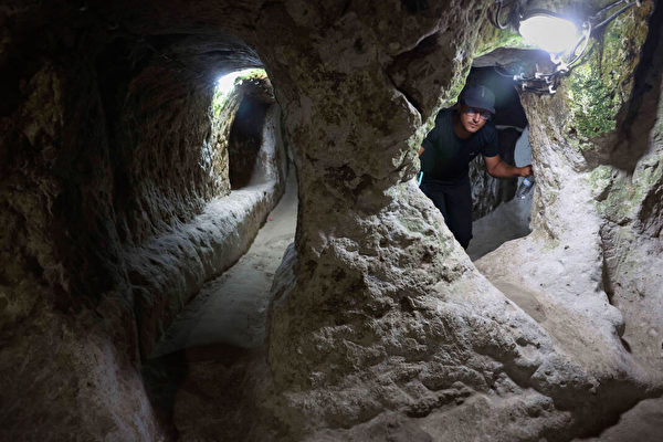 土耳其中部卡帕多细亚(Cappadocia)有一座庞大的地下城市。一名游客走过土耳其德林库尤地下城