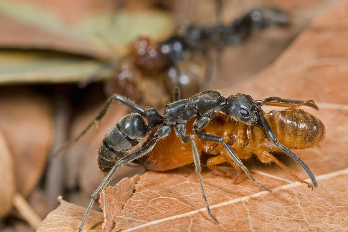 在几内亚的里约卡帕切斯,一只马塔贝列蚁在突袭行动中带走它的白蚁猎物。